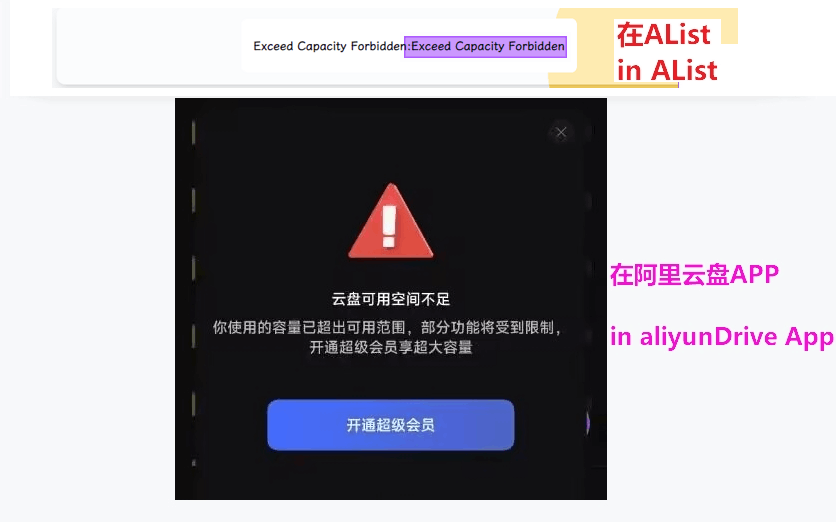 ExceedCapacityForbiddenerrorA:User capacity exceeded, playback restricted, need to expand or delete unnecessary files to free up space,The prompts of the Alist and Alibaba Cloud Drive APP are as shown below