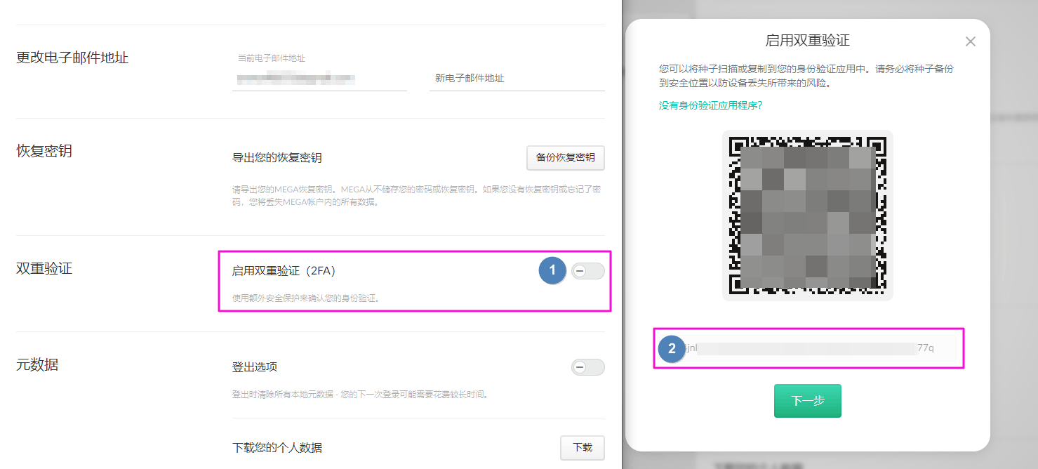 Click to enable Enable two-factor authentication (2FA) and then see a QR code, there is a string of letters below the QR code, This is Two fa secret, please record before scanning the code and do not lose it, Should the Two-factor authentication (2FA) secret be lost, you can unbinding and then retrieve a new 2FA QR code for setup.